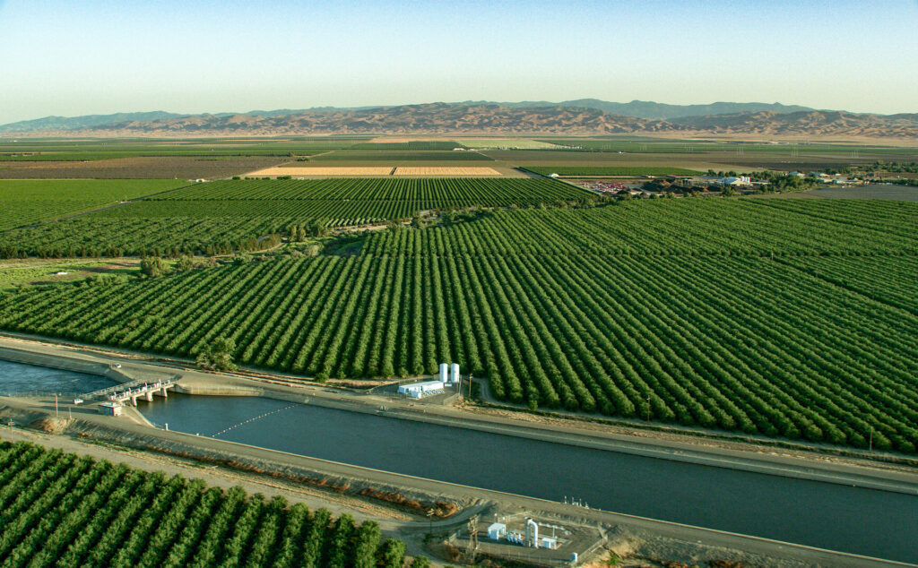The aerial view looks south toward the California Aqueduct near South Fairfax Avenue and the Panoche Creek Shipon in the agricultural rich Central Valley of Fresno County, California. Image credit: California Department of Water Resources (2023)