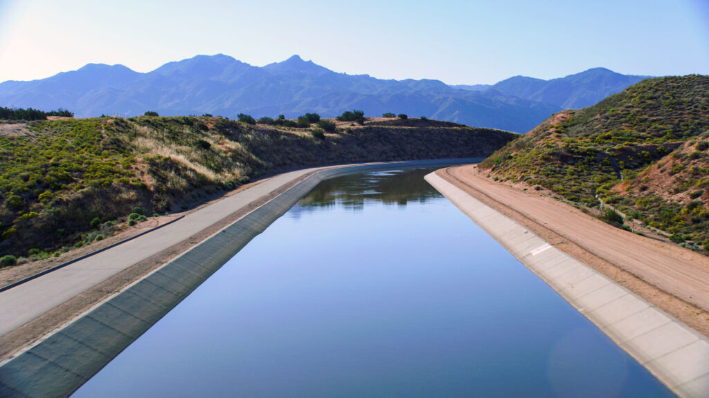 The California Aqueduct East Branch runs into the Mojave Siphon Powerplant, under the Mojave River bed and the Las Flores Valley floor, through the power plant before entering Silverwood Lake. California. Image credit: California Department of Water Resources (2023)