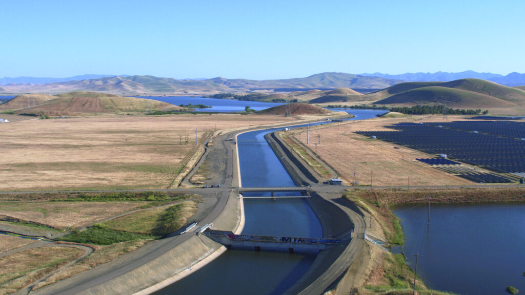 The California Aqueduct and the O’Neill Forebay, part of the San Luis Joint-Use Complex. Water from the Delta-Mendota Canal, part of the federal Central Valley Project is pumped into the forebay. In Merced County. Image credit: Department of Water Resources (2023)